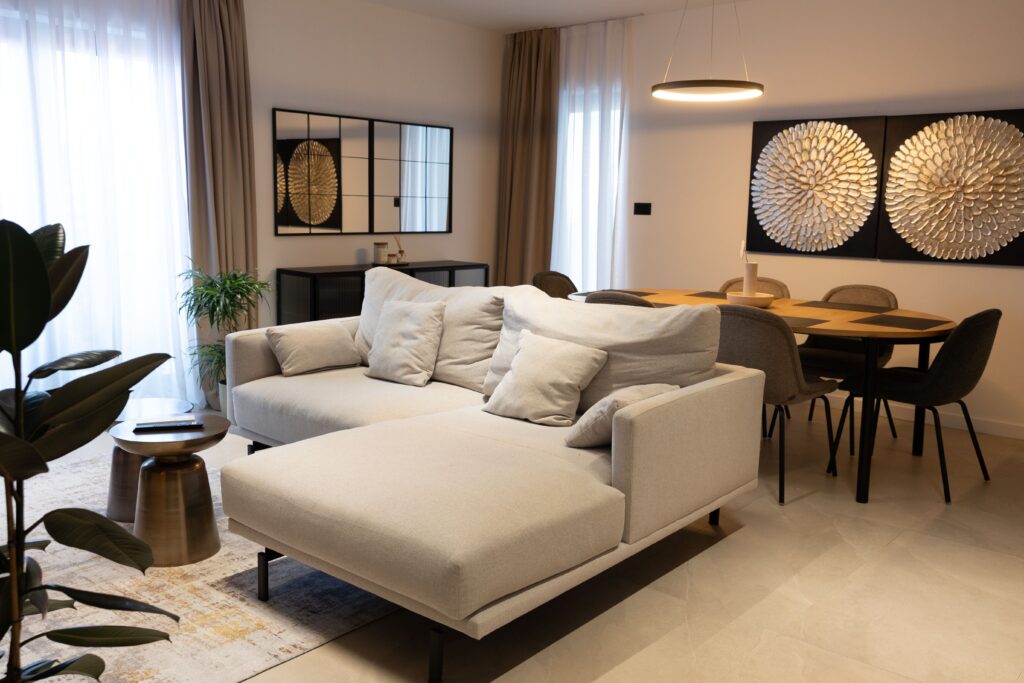 Our Superior apartments are 57 m² comfortable apartments which can accommodate 2 adults and optionally 2 children as they are equipped with large sofas that can potentially become sofa beds. They consist of one Bedroom, one living room, one Bathroom, a fully equipped kitchen, and a dining area with a sea view.