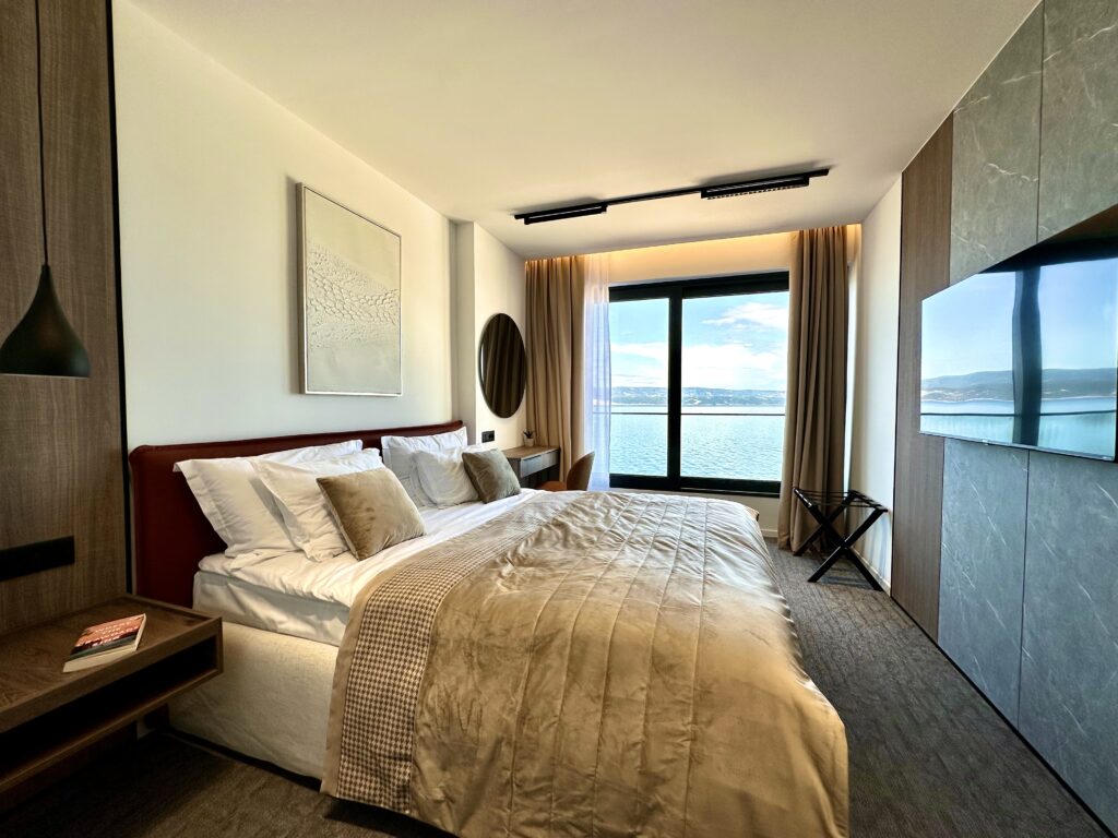 Our Superior apartments are 57 m² comfortable apartments which can accommodate 2 adults and optionally 2 children as they are equipped with large sofas that can potentially become sofa beds. They consist of one Bedroom, one living room, one Bathroom, a fully equipped kitchen, and a dining area with a sea view.